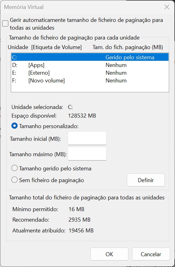 Nota: O tamanho da memória virtual não é o mesmo em todas as situações. No entanto, deve ser usado um tamanho que seja, pelo menos, uma vez e meia a capacidade da memória RAM no tamanho inicial e três vezes no tamanho máximo. Outra coisa que tem de ter conta é que o suporte de armazenamento tem de ter espaço disponível para o ficheiro.