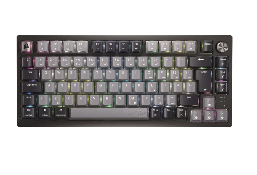 Este teclado é um dos mais confortáveis que já usámos e a tecnologia que a Corsair usou na montagem oferece um equilíbrio excelente entre o ruído e a precisão, graças à combinação de um interior de silicone e um apoio de espuma. Um outro aspecto que ajuda muito neste campo é a textura das teclas – rugosa, mas não muito. Os interruptores são MLX Red da própria Corsair (semelhantes ao MX Red da Cherry) e, para já, não é possível comprar este teclado noutra versão. Um aspecto interessante é que o K65 Plus Wireless é compatível com Mac e PC, sendo que as teclas modificadoras trazem marcações para ambas as plataformas.
