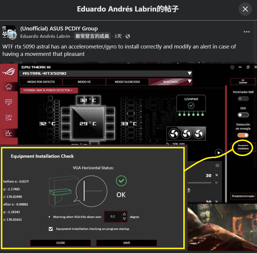 O software de monitorização GPU Tweak da Asus aparentemente recebeu uma nova funcionalidade chamada “Equipment Installation Check” por volta da altura em que a Nvidia lançou as suas placas gráficas da série RTX 50 em Janeiro. Clicar no lado direito da janela produz um cálculo preciso do ângulo horizontal da placa gráfica, com um aviso se este descer demasiado.