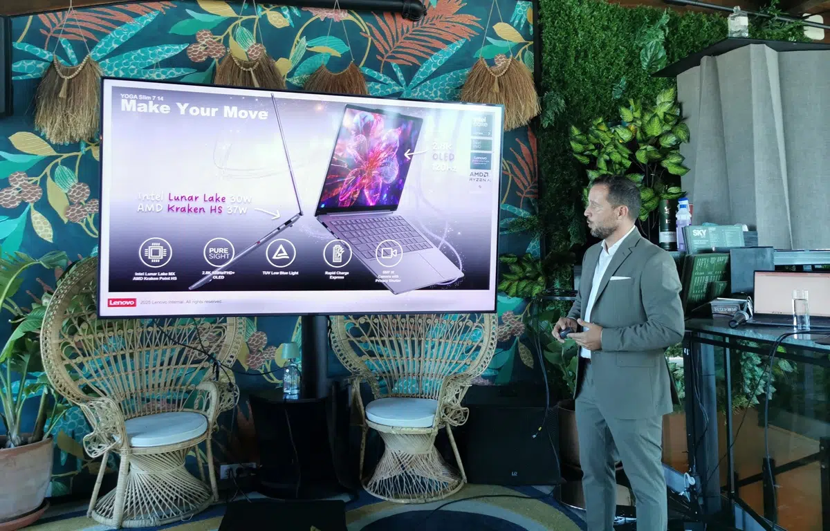 Coube a António Paulo, Iberia consumer product manager da Lenovo, a apresentação das novidades da marca para 2025 para o mercado português com destaque para a gama Yoga e os novos Slim 9 e Slim 7 Aura Edition. O primeiro é um portátil que é «mais premium» da gama com «uma relação entre o corpo e ecrã de 98%». Outros dos destaques deste equipamento são ser revestido a «vidro anti-dedadas», ter uma webcam de 32 MP escondida no display que «só se nota quando está em utilização» e um ecrã 4k 120 Hz POLED, ou seja, de plástico «para baixar o consumo, ter maior durabilidade e ser mais leve», mas «mantendo a mesma qualidade de contraste e de cores». Este modelo terá um PVP que começa nos 2499,99€.