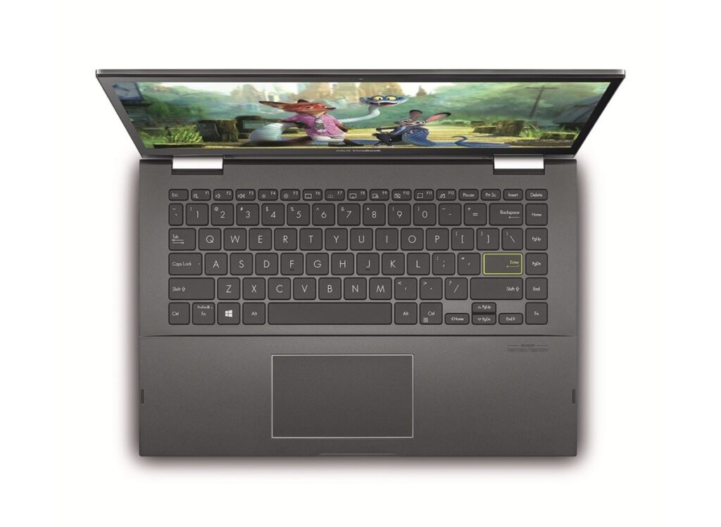 Como o nome indica, o Vivobook 14 Flip tem um ecrã OLED de catorze polegadas e, dado que pode funcionar em modo tablet, é sensível ao toque em até dez pontos, simultaneamente. Este modelo não é dos portáteis mais finos que já vimos, mas ainda assim é fácil de transportar, visto pesar 1,5 kg. Quando viramos o ecrã para trás e fica a funcionar em modo tablet, a espessura nota-se mais, porque, ao chassis, é adicionada a espessura do ecrã. Embora seja uma máquina de gama média, gostámos da qualidade geral da construção, mas não ficámos fãs do trackpad, que, não sendo pequeno, oferece pouca precisão.