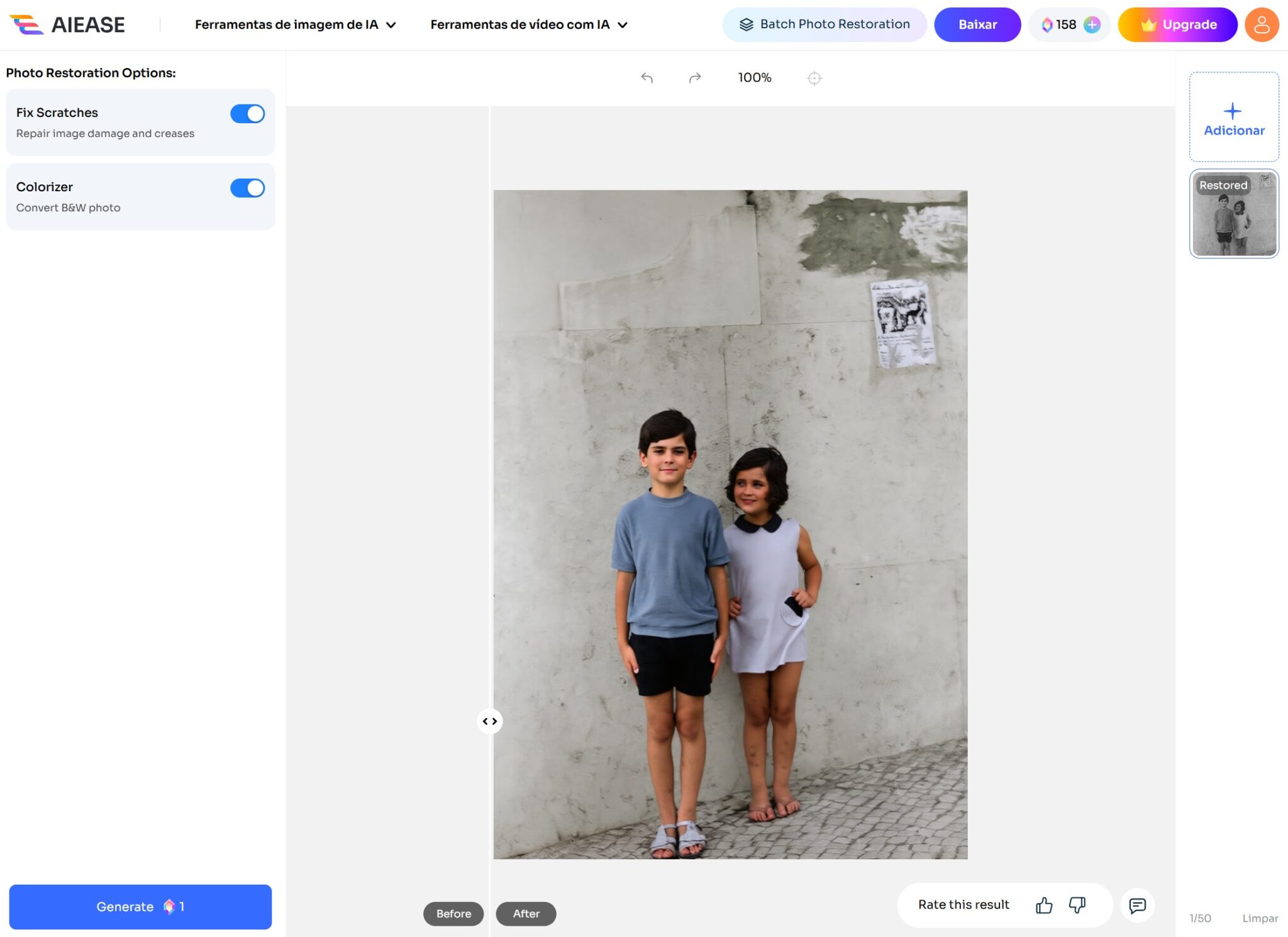 A IA deteta o ruído e remove-o sem comprometer a nitidez. Também otimiza o contraste e a saturação de forma inteligente, ajustando-os a cada fotografia. É particularmente eficaz com imagens antigas ou digitalizadas a partir de fotografias físicas, onde a cor e a clareza foram perdidas com o tempo.