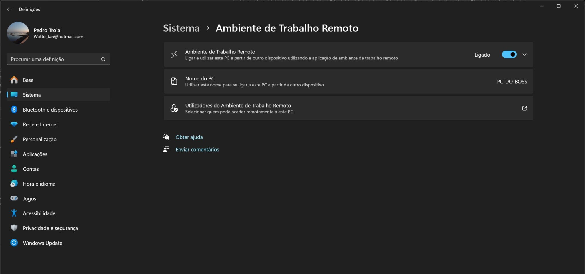 Aceda às Definições do Windows 11 (Tecla Windows+I ou através do menu ‘Iniciar’) e clique em ‘Sistema’ e procure o botão ‘Ambiente de Trabalho Remoto’ na coluna da direita.