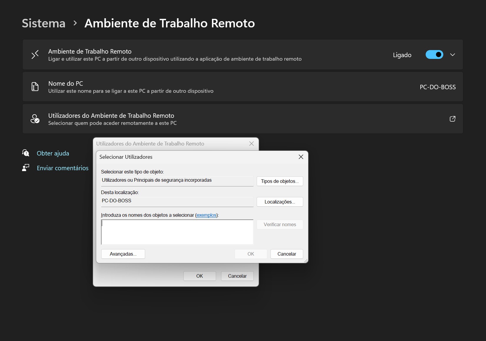 O sistema dá permissão automática ao utilizador para aceder remotamente ao PC. Para dar acesso a outro utilizador, clique em ‘Utilizadores do Ambiente de Trabalho Remoto’ e clique em ‘Adicionar’ para especificar a identidade do utilizador.