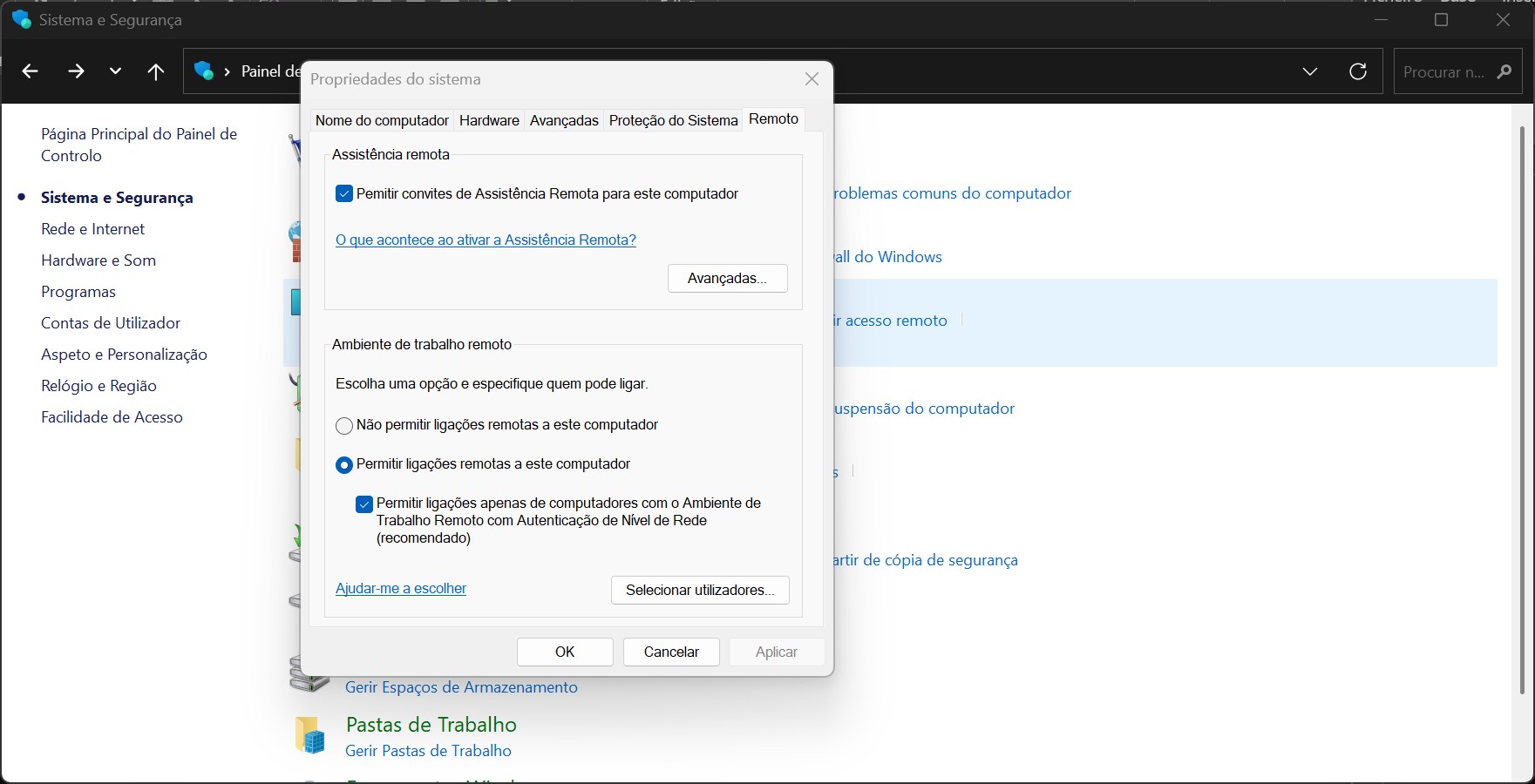 Quando liga a opção de permitir ligações remotas, o sistema também liga automaticamente o a autenticação de nível de rede.