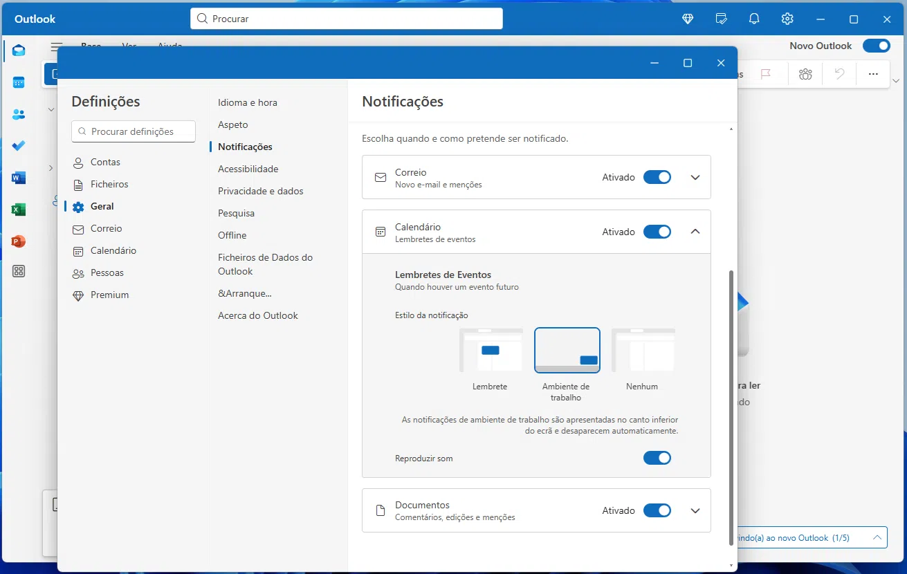 Na nova versão do Outlook, clique na engrenagem no canto superior direito, seguido de ‘Geral’ > ‘Notificações’. No menu dropdown ‘Calendário’ vai ver três opções no ‘Estilo de notificação’: ‘Lembrete’, ‘Ambiente de trabalho’ e ‘Nenhum’. Escolha um dos dois primeiros e os seus lembretes aparecerão por cima de todas as outras janelas.