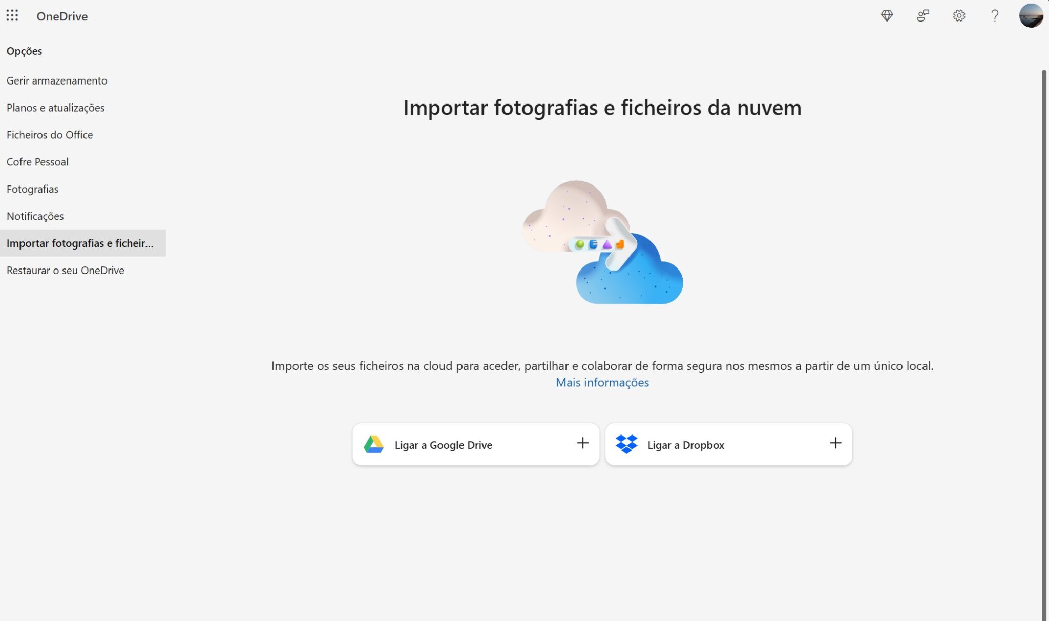 Se deseja usar o OneDrive como o seu único fornecedor de armazenamento online, o serviço oferece opções para importar os seus ficheiros do Google Drive e Dropbox (mas não do iCloud).