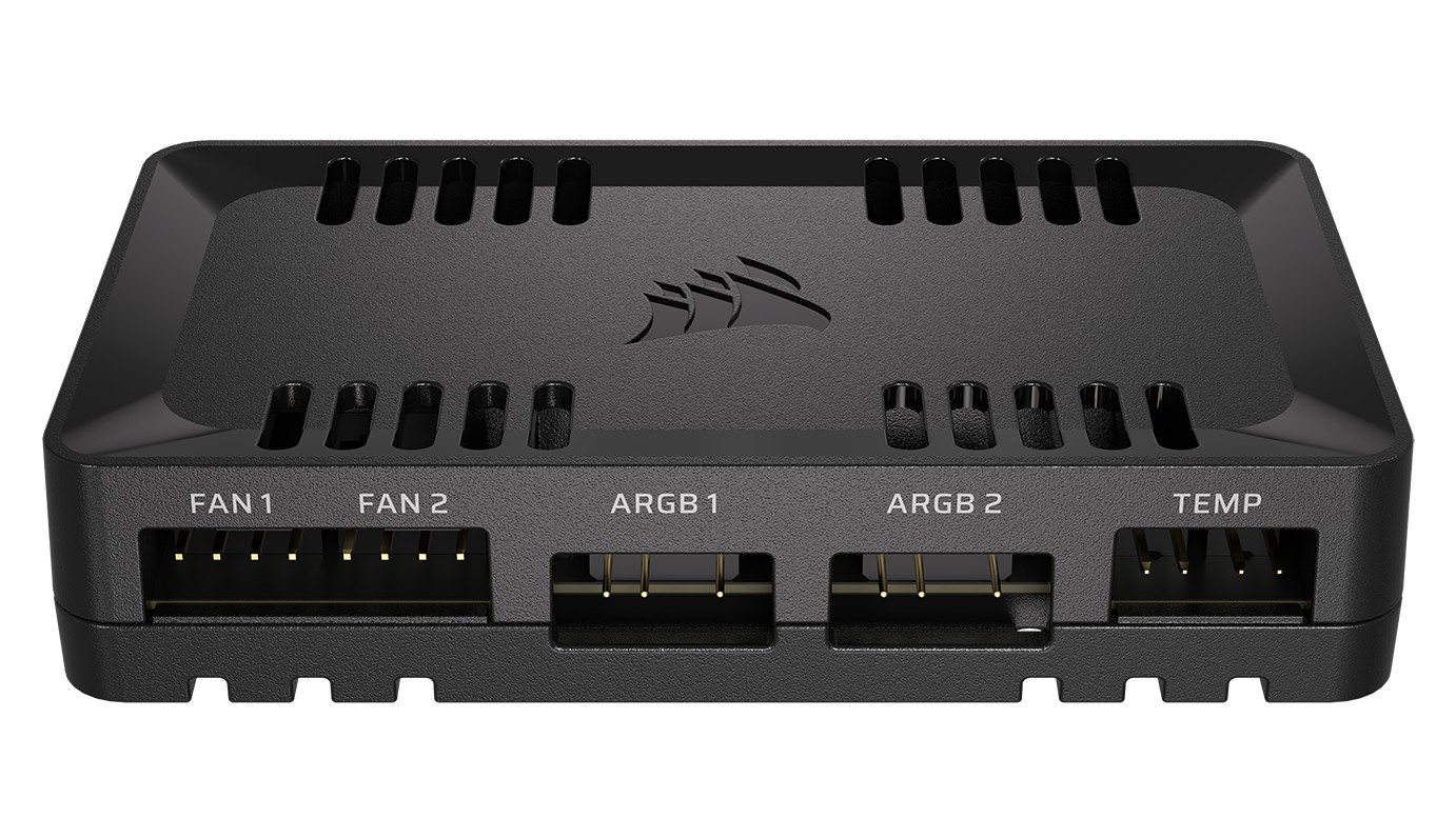 Existem dois canais disponíveis para o controlo de ventoinhas PWM ARGB, suportando até seis ventoinhas padrão por canal, para um total de 12, incluindo a nova ventoinha RGB de rotor inverso Corsair RS-R. Cada canal pode ter a sua velocidade e iluminação RGB facilmente sincronizadas e geridas através do software iCUE.