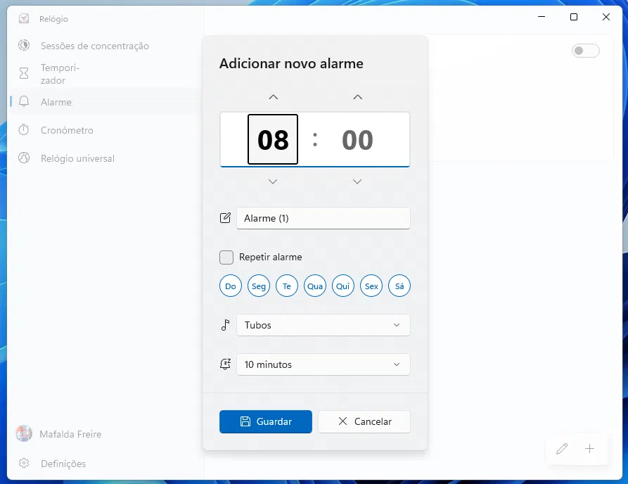Agora, clique nas teclas ‘Ctrl+N’ para iniciar um novo temporizador ou alarme e use a combinação das teclas das setas e ‘Tab’ para definir a hora desejada. No final, clique em ‘Enter‘ quando o botão ‘Guardar’ estiver seleccionado.