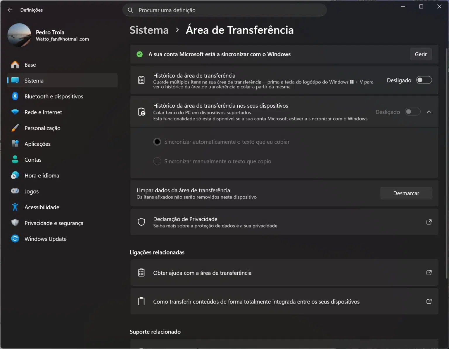 - Ligue o Histórico: Active a chave em Histórico da área de transferência.