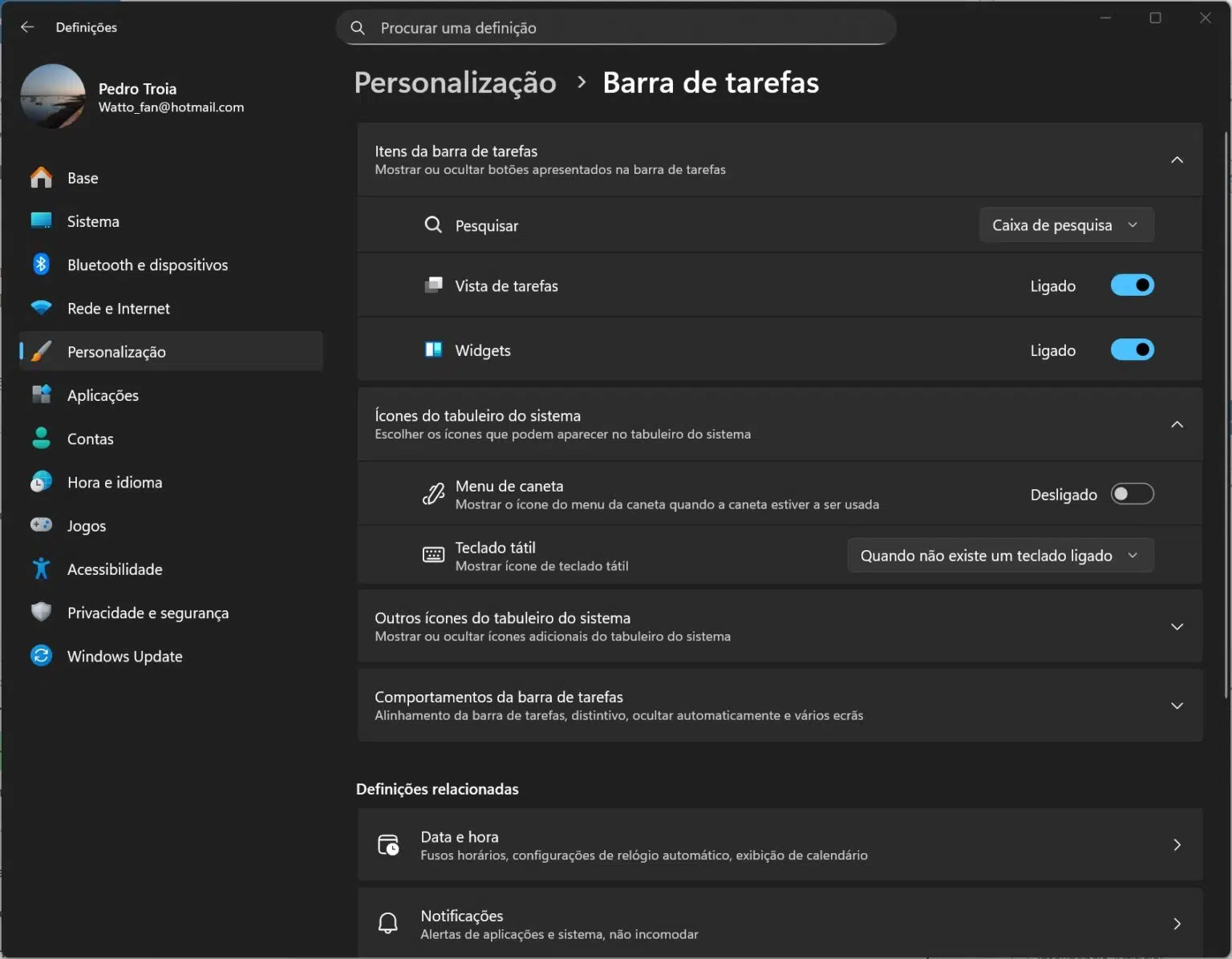3. Na secção “Itens da barra de tarefas”, pode desligar os interruptores dos ícones que deseja remover, como ‘Pesquisar’, ‘Vista de tarefas’ ou ‘Widgets’.