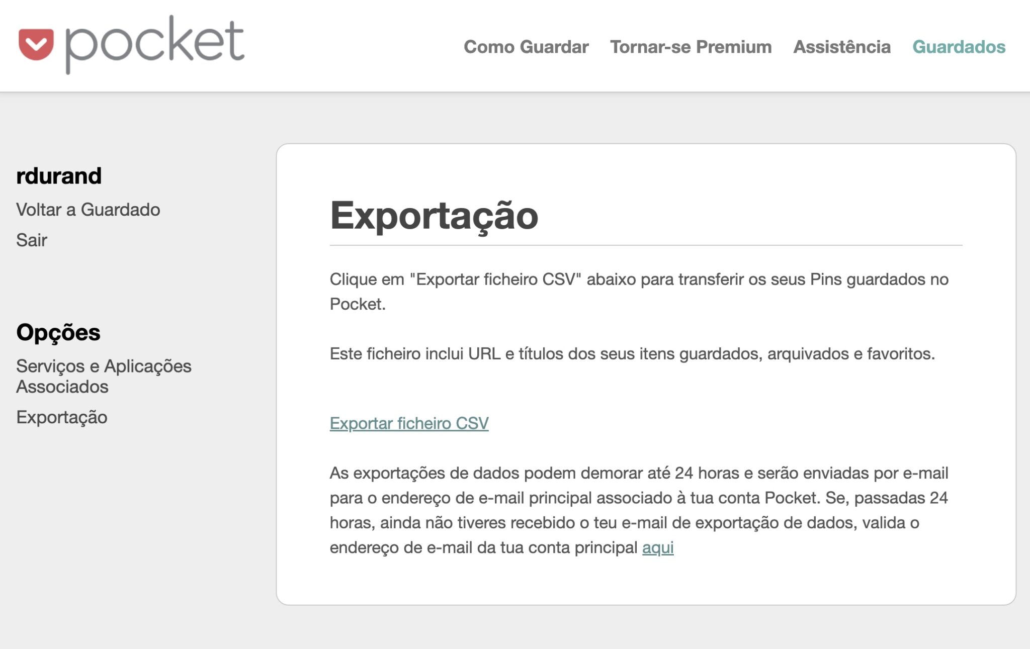 Se não quiser transferir os artigos guardados para outro serviço, pode exportá-los directamente para ficarem guardados no seu computador (também terá de fazer isto se quiser usar o Instapaper, embora com o Matter não seja necessário). Aceda a getpocket.com/export, faça login na sua conta e clique na ligação ‘Exportar ficheiro CSV’; assim que fizer isto, o Pocket vai enviar um e-mail com este ficheiro (é mostrada uma confirmação), não sendo possível fazer o download no momento. Isto pode demorar até sete dias a chegar e fica disponível para download durante 48 horas (se não o fizer, não se preocupe, uma vez que pode gerar uma nova ligação repetindo o passo anterior). No nosso caso, o e-mail chegou cerca de duas horas depois de termos feito o pedido (veja na pasta de spam se não tiver chegado ao fim de um ou dois dias): clique no link para fazer o download do ficheiro CSV.