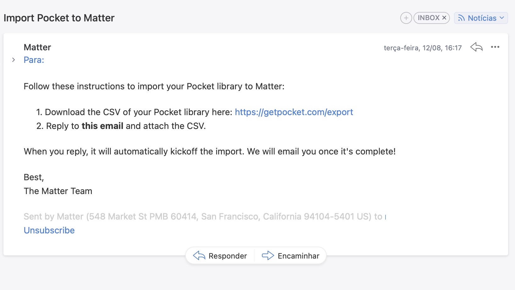 No iOS, instale a app Matter e escolha ‘Yes’ I’m joining from Pocket’; vai passar por uma série de passos para especificar as suas preferências de leitura e, no final, pode criar uma conta. Depois de fazer isto, no ecrã que aparece, toque em ‘Import from Pocket’, para receber instruções por e-mail de como pode importar as suas listas do antigo serviço: temos de enviar o CSV em resposta a este e-mail, algo que a Matter diz que dá início de forma automática à importação, um processo que fica concluído no prazo de, no máximo, duas horas. Assim que isto estiver concluído, a app manda outro e-mail a avisar.