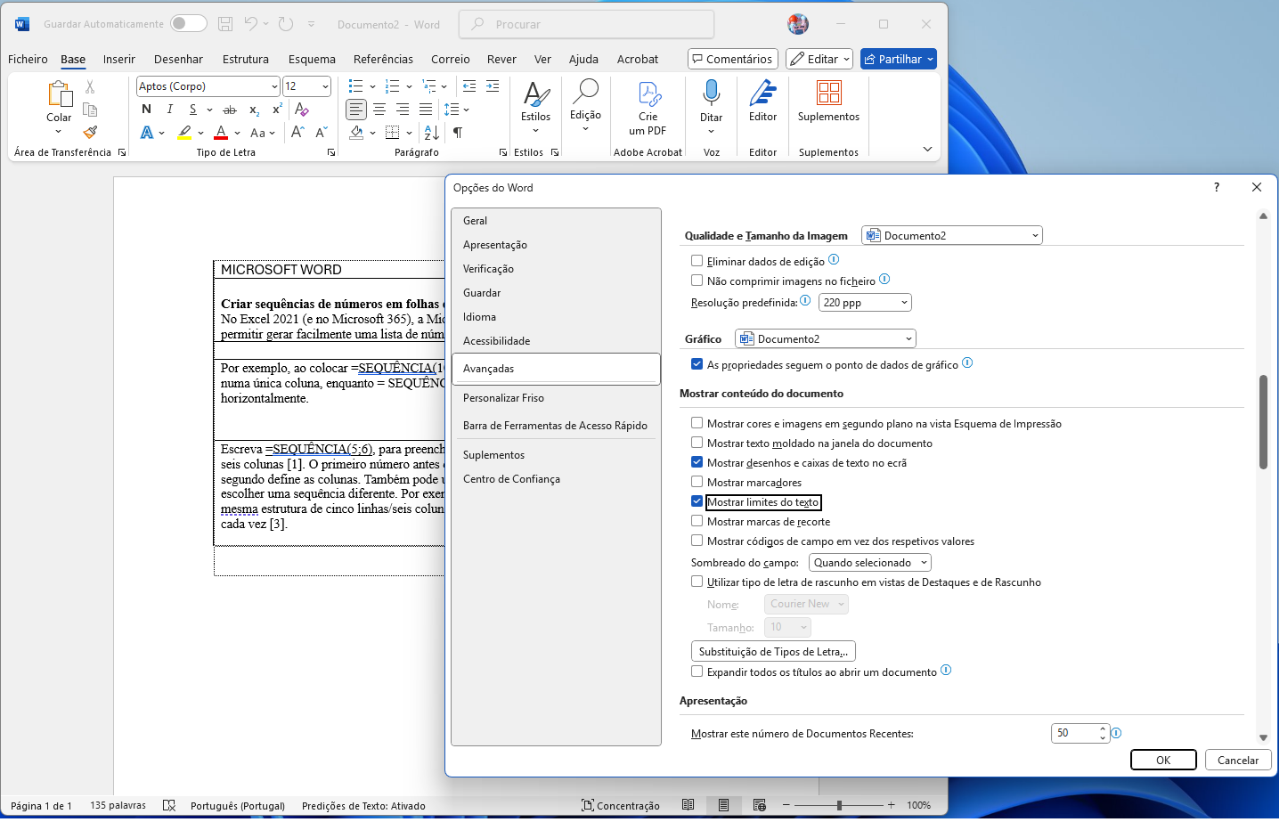 Assim, em vez de adivinhar onde estão as margens ou mexer no espaçamento, consegue ter uma visão clara de onde o texto deve ficar. Para activar esta funcionalidade, vá a ‘Ficheiro’ > ‘Opções’ > ‘Avançadas’, faça scroll para baixo até ‘Mostrar conteúdo do documento’ e seleccione ‘Mostrar limites do texto’. Mas, atenção: esta opção pode ser algo que não quer deixar activado, pois consegue ser confusa; aconselhamos a usar apenas quando o alinhamento é importante, já que, nessas circunstâncias, é um guia visual muito útil.