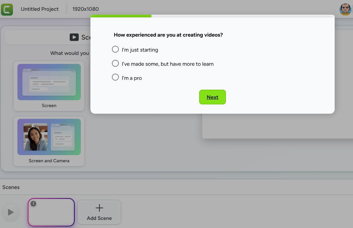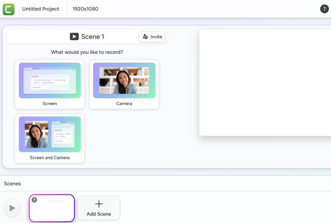 2 –Clique em ‘Untitled Project 1’ e dê um nome ao seu vídeo. Depois, escolha o que quer gravar, clicando em ‘Screen’, ‘Camera’ ou ‘Screen and Camera’ (ou seja, gravar apenas o que aparece no ecrã, apenas o que a webcam está a captar ou uma mistura dos dois). Neste caso, vamos escolher ‘Screen’. Entretanto, explore a interface do Camtasia: a secção ‘Scenes’ mostra o seu vídeo numa timeline, dividido por partes.