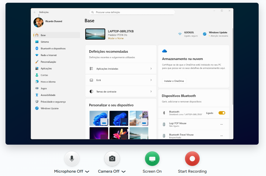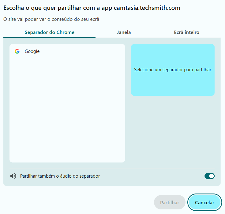 3 – Agora, tem de indicar ao Camtasia exactamente o que o programa tem de gravar, clicando na opção correspondente na caixa que aparece: ‘Separador do Chrome’, a ‘Janela’ de um programa ou o ‘Ecrã inteiro’. Para este guia, vamos criar um vídeo que mostre como desinstalar programas: abra as ‘Definições do Windows’ em segundo plano (não minimize) e, em seguida, escolha ‘Janela’, no Camtasia. Aqui, deve já aparecer a opção ‘Definições’, uma vez que o programa detecta que tem esta janela aberta. Clique em ‘Partilhar’ para começar a gravação.