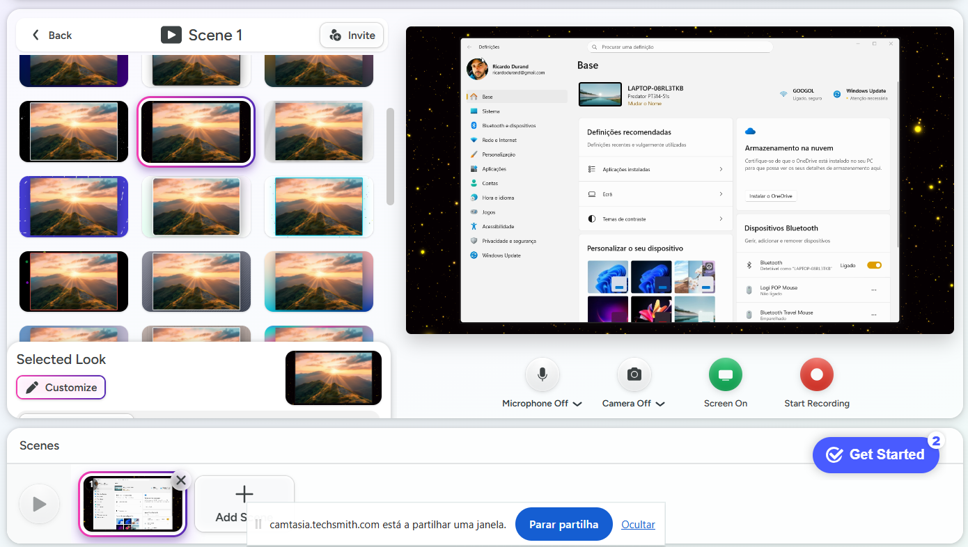 4 – A janela que está a gravar será colocada sobre um fundo à sua escolha: vá clicando nas várias opções e veja o resultado em tempo real, à direita. Depois, clique em ‘Customize’ para alterar as cores, adicionar um reflexo ou uma sombra e, até, aplicar um fundo animado, se quiser. Muitas das opções são bastante vistosas, mas certifique-se de que não desviam a atenção da mensagem que quer transmitir.