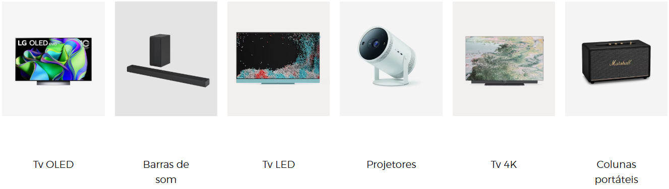 Para transformar o seu espaço de entretenimento, a secção de Som e Imagem inclui modelos de televisores (p. ex., LED, OLED, QLED e 4K UHD), barras de som, colunas portáteis e sistemas de home cinema.