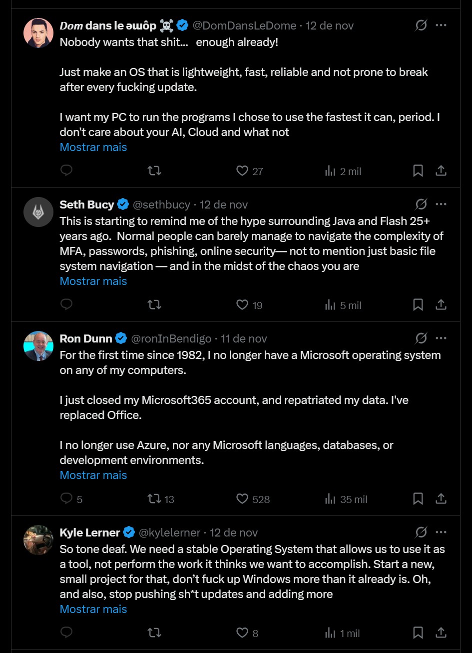 A publicação de Davuluri pretendia preparar o palco para a conferência Ignite da Microsoft, que decorre de 18 a 21 de Novembro. No entanto, muitos utilizadores do Windows aproveitaram a oportunidade para expressar a sua frustração, acusando Davuluri de ignorar repetidos apelos para que pare de adicionar mais funcionalidades de IA ao Windows.