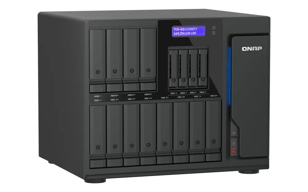 O chassis do TVS-AIh1688ATX permite uma configuração de armazenamento híbrida, disponibilizando 12 baías para discos rígidos SATA e quatro ranhuras dedicadas a SSD M.2 NVMe ou SATA. Esta estrutura permite às empresas configurar pools de armazenamento SSD de alta velocidade ou utilizar a aceleração de cache para aplicações sensíveis à latência, como a edição de vídeo 4K/8K.