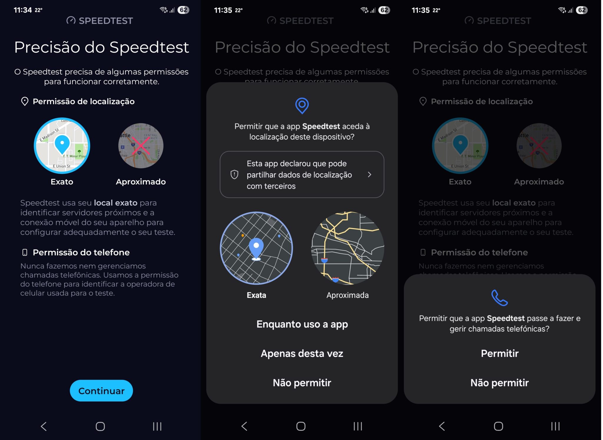 1- Instale a Ookla Speedtest (Android ou iOS) no seu telemóvel ou tablet. Quando abrir a app pela primeira, esta vai solicitar que dê permissão para aceder à sua localização precisa; aconselhamos que opte por fazer isso apenas enquanto estiver a usar a aplicação. Se estiver a usar um smartphone, vai ainda perguntar se quer permitir que faça a gestão das chamadas telefónicas para que possa testar a velocidade da sua ligação à Internet móvel. No ecrã final, clique em ‘Reject All’ para impedir que a Ookla partilhe os seus dados com anunciantes.