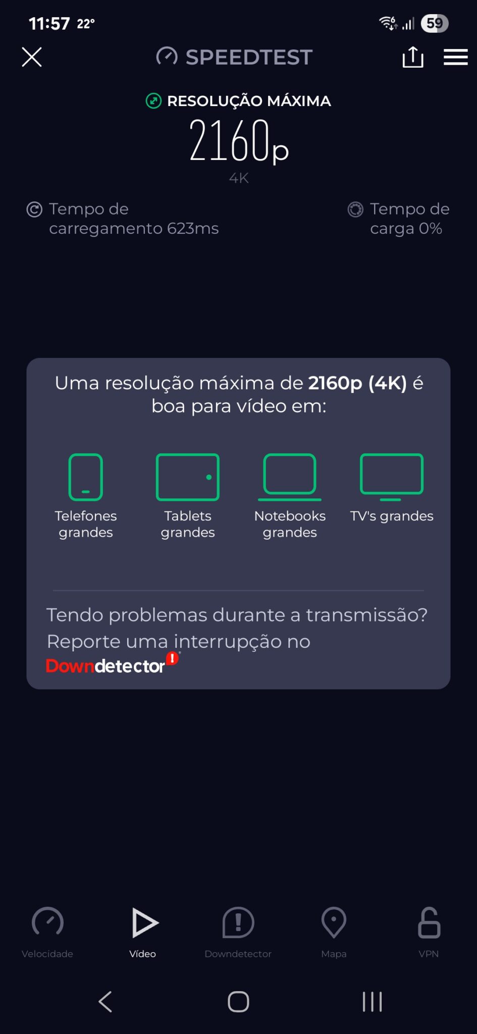 3- No separador ‘Vídeo’, pode testar a taxa de bits adaptativa da sua ligação, que determina a qualidade da transmissão de vídeo até 4K. O Speedtest indica a resolução máxima suportada pela velocidade actual da Internet e em quais dispositivos vai conseguir ver vídeos de forma fiável e em alta qualidade. Embora este teste não seja essencial, pode ajudar a identificar se o buffering e a má qualidade da imagem são causados pela sua ligação ou são responsabilidade do serviço de streaming que está a ver.