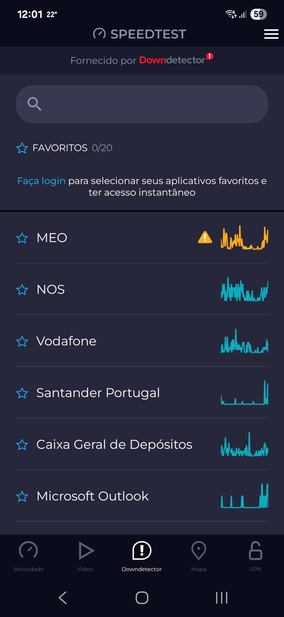 4- Em seguida, no separador ‘Downdetector’, veja que serviços online, sites, aplicações, além do seu ISP e rede móvel, estão a sofrer interrupções e problemas de desempenho. Estes dados são baseados em relatórios de utilizadores, sendo constantemente actualizados e exibidos na forma de gráficos de linhas coloridas. Por exemplo, um gráfico vermelho indica um volume elevado de relatórios recentes, os amarelos significam um número moderado e os azuis, que tudo aparenta estar a funcionar bem.