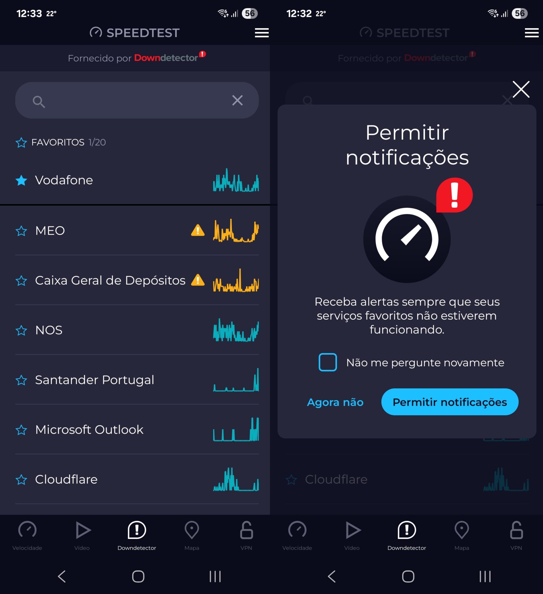 6- Uma nova funcionalidade na aplicação Speedtest permite-lhe guardar até vinte empresas como favoritas, para que possa ver instantaneamente quando os seus serviços estão com falhas/problemas e receber notificações quando tal acontecer. Para ter acesso a está opção, terá de criar uma conta gratuita; para isso, vá até ao menu de três linhas no topo superior direito e, em seguida, escolha ‘Criar conta’. Depois de iniciar sessão, clique numa estrela ao lado do nome de um serviço para adicioná-lo aos ‘Favoritos’. Em seguida, seleccione ‘Permitir notificações’ – esta operação só será necessária para a primeira empresa que adicionar.