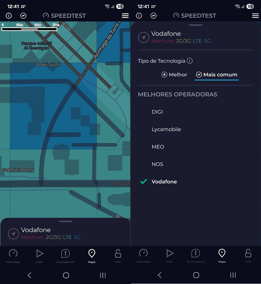 7- A outra das novas funcionalidades do Speedtest, que compara a velocidade da sua banda larga com outros ISP na sua área, está actualmente limitada aos EUA. No entanto, o separador ‘Mapa’ permite-lhe verificar como está a sua ligação móvel, em comparação com outras. Seleccione a sua rede, se não for detectada automaticamente, para ver um mapa com cores que mostram as melhores velocidades alcançadas na sua zona. Os quadrados amarelos correspondem a rede 2G/3G, os esverdeados ao LTE (4G) e os azuis ao 5G. Pode ainda alternar os dados de velocidade de ‘Melhor’ para ‘Mais comum’.