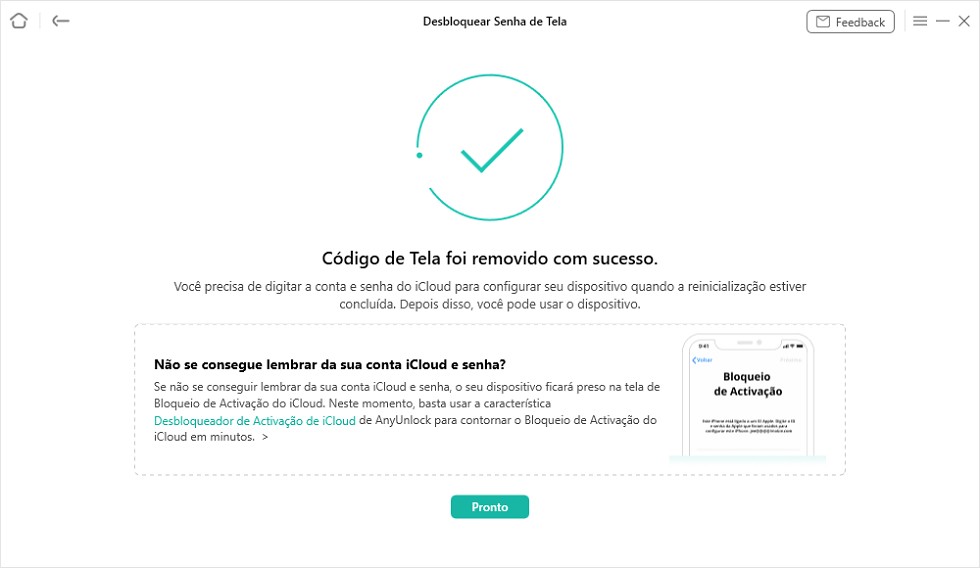 Não confunda as senhas. Os métodos acima removem a senha de tela (4 ou 6 dígitos). Após o aparelho reiniciar, ele pedirá seu e-mail e senha do ID Apple (Bloqueio de Ativação) para provar que você é o dono. Se você também esqueceu essa senha, precisará recuperá-la no site `iforgot.apple.com`. Claro, o AnyUnlock também pode resolver esse tipo de problema. Além de remover o bloqueio de tela, ele também pode remover bloqueio de ativação, o ID Apple, o MDM, etc.