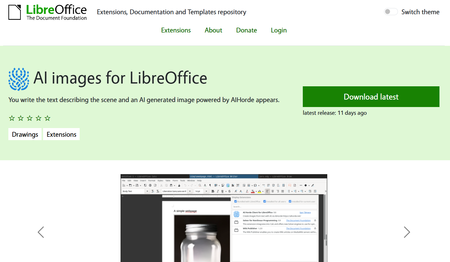 Para adicionar a ferramenta de geração de imagens, visite a página da extensão ‘AI Images for LibreOffice’, procure pela mesma no repositório que indicámos e clique no resultado para abrir a página respectiva. Aqui, basta carregar em ‘Download latest’. Feito isto, ficamos com um ficheiro chamado ‘loshd.oxt’, no qual deve clicar duas vezes. Isto faz abrir um aviso – clique em ‘Aceitar’. Depois, reinicie o LibreOffice; quando voltar a abrir o programa, vai poder ver que a extensão está no topo da lista.