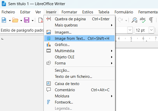 No LibreOffice Writer, clique em ‘Inserir’ > ‘Imagem from Text’ e escreva uma descrição da imagem que quer criar, usando pelo menos cinco palavras. Contudo, o melhor é ser o mais detalhado possível, descrevendo tanto o conteúdo da imagem como o seu estilo (‘cartoon’, ‘foto-realista’, ‘esboço’, por exemplo).