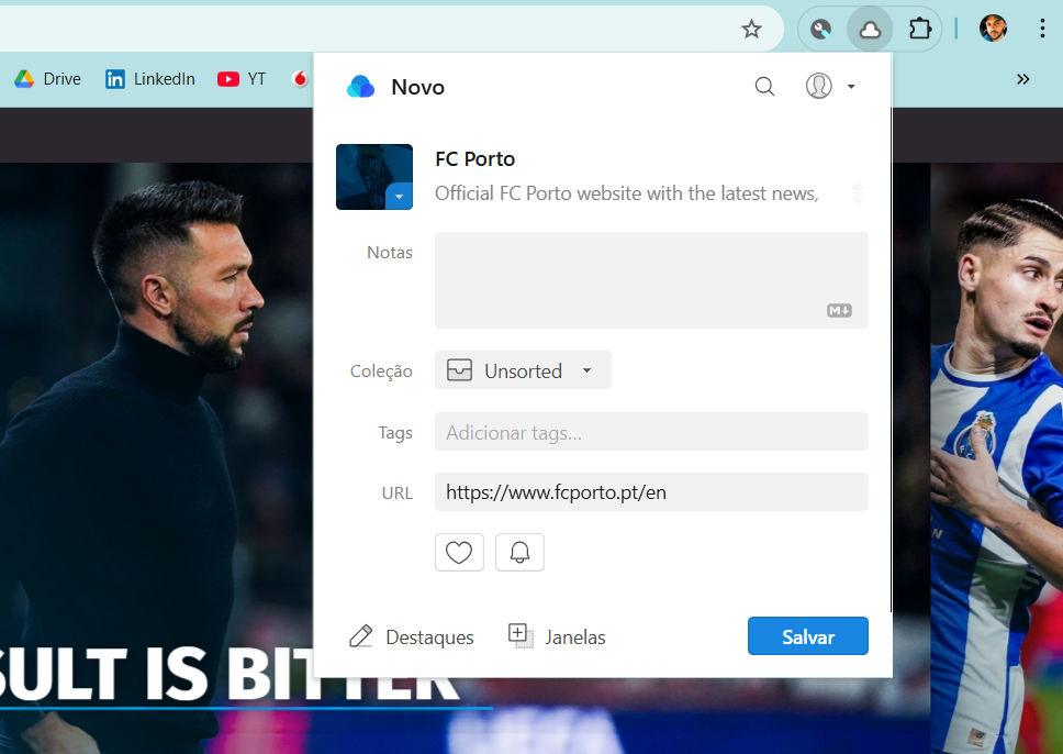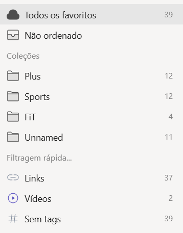 No menu que aparece, pode adicionar uma nota e escolher uma pasta específica no menu ‘Não ordenado’. Caso queira adicionar o favorito a uma nova pasta, tem de voltar à página inicial do Raindrop: clique no sinal ‘+’ no canto superior esquerdo e dê um nome à nova ‘Colecção’. De seguida, volte a adicionar o marcador, agora à sua nova pasta — no nosso caso, ‘Desporto’.