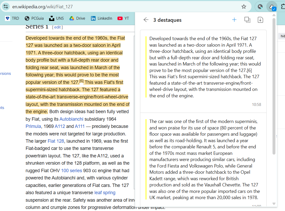 Neste caso, queremos guardar uma página da Wikipédia sobre o automóvel FIAT 127 para usar num trabalho. Como é de esperar, há muita informação interessante, mas neste momento apenas nos interessa a secção dedicada à primeira geração deste modelo, a Series 1.