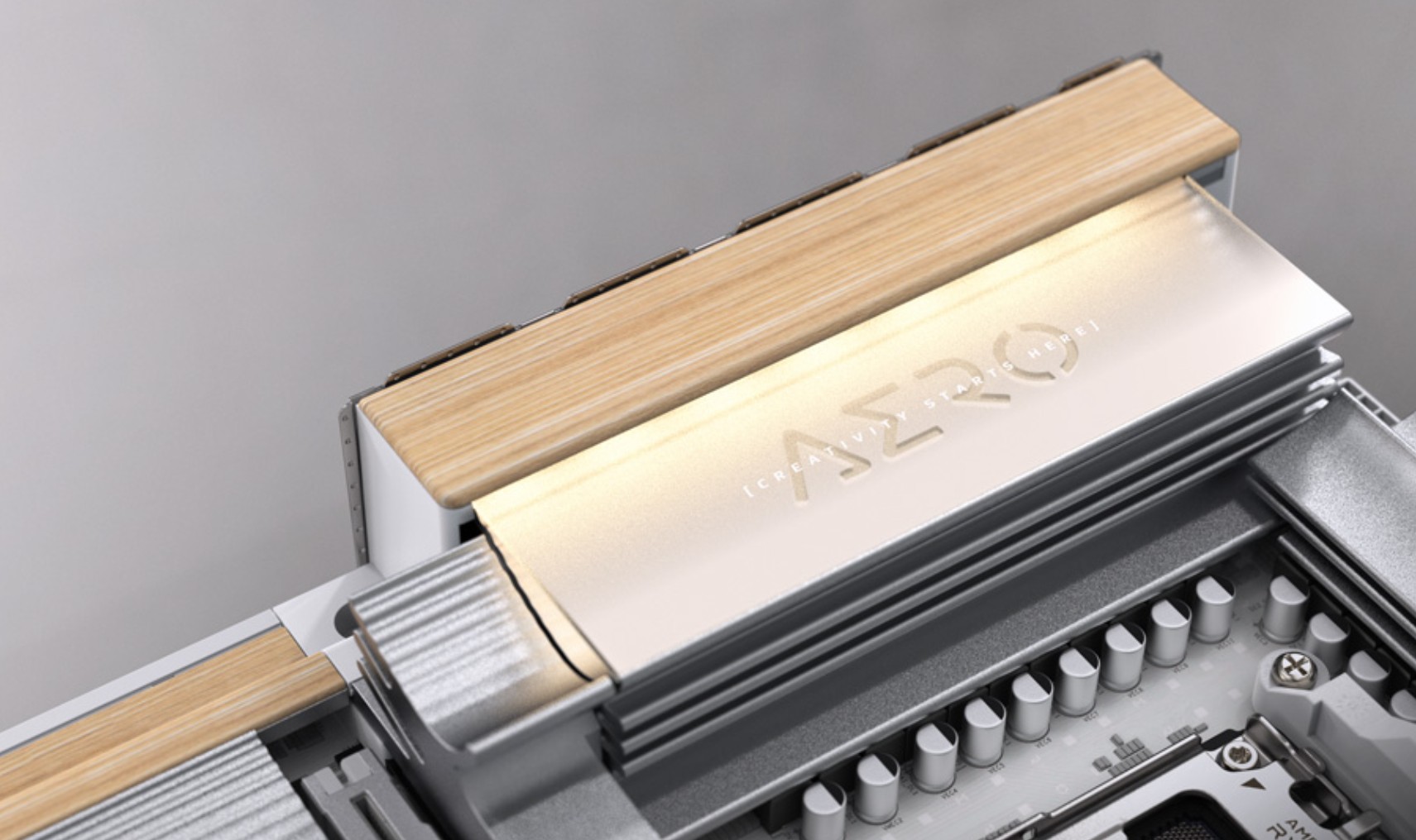 Acabamentos em madeira: A madeira reveste as extremidades da motherboard, o módulo regulador de voltagem e o dissipador M.2.