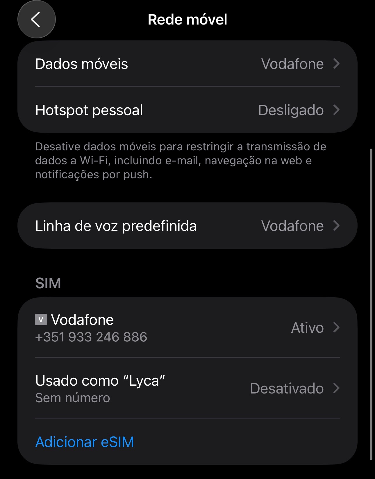 1 – Comece por colocar o iPhone e o smartphone Android lado a lado: no primeiro, entre nas ‘Definições’ e toque em ‘Rede móvel’. Se já tiver um eSIM, pode configurar outro sem problema, mas apenas consegue usar um de cada vez. Para dar início a este processo, toque em ‘Adicionar eSIM’.