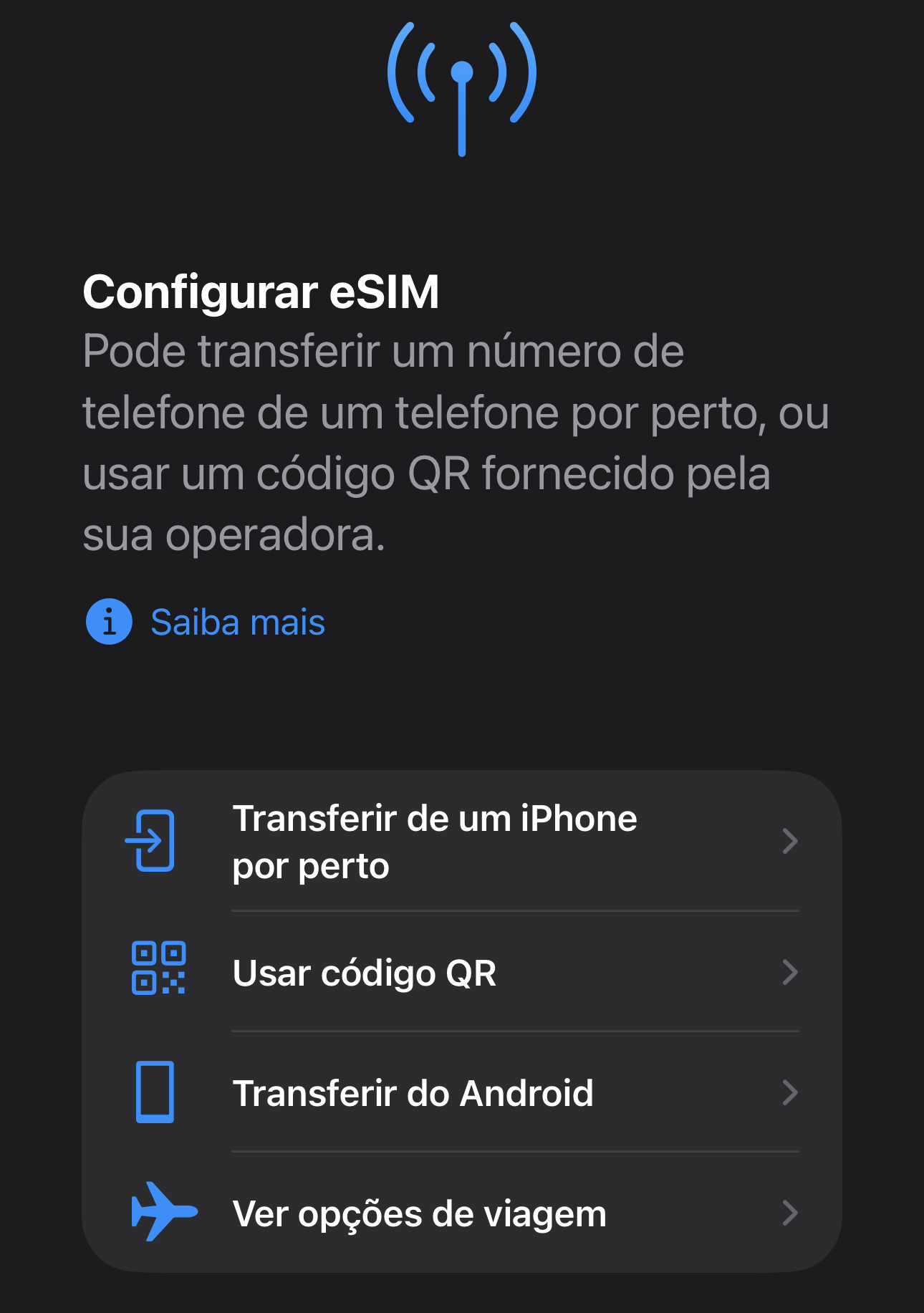 2 – No menu que aparece, a opção é óbvia: ‘Transferir do Android’. Repare que também pode fazer o mesmo a partir de um iPhone (por exemplo, se já tiver um eSIM num modelo 15 ou 16 e agora tiver comprado o Air) ou usar um código QR. Neste caso, é preciso ter um suporte físico (impresso em papel, quando se compra numa loja) ou digital (quando é enviado por e-mail).