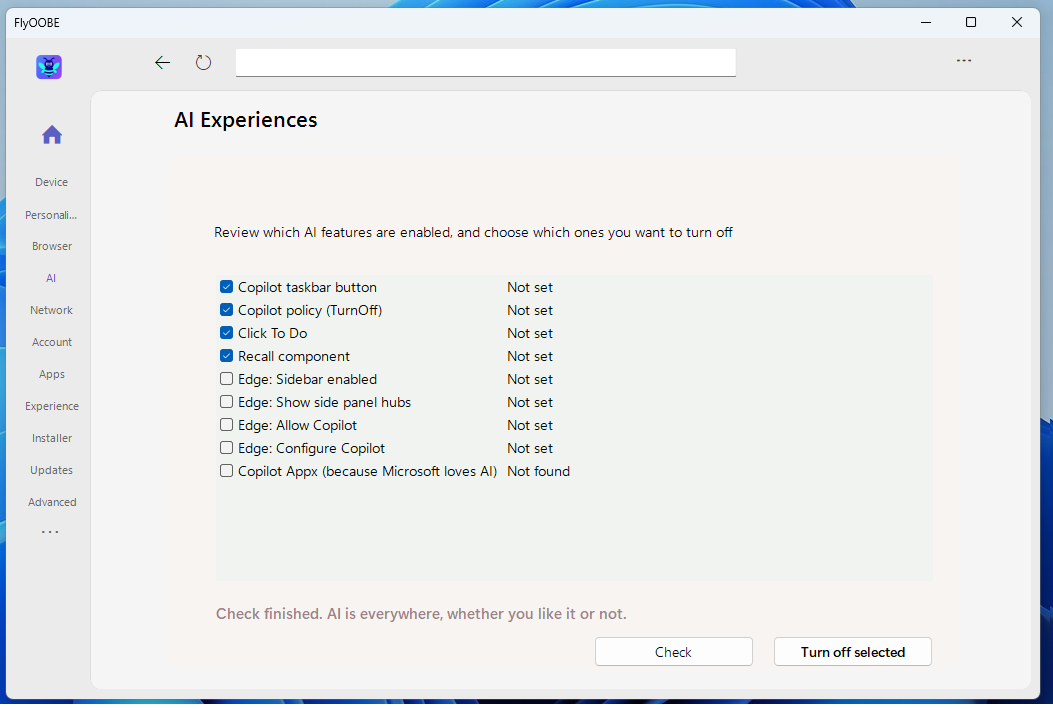 4- Quando a configuração do Windows 11 estiver concluída e o sistema operativo iniciar, vá ao Flyoobe para desactivar funcionalidades de IA que não pretenda usar. Clique em ‘IA’ no menu à esquerda e depois no botão ‘Check’ e ser-lhe-á apresentada uma lista. Escolha as ferramentas que quer desactivar e clique ‘Turn off selected’. Para remover completamente o Copilot do Windows 11, escolha ‘Copilot Appx’ – se mudar de ideias, pode sempre reinstalá-lo a partir da Microsoft Store.