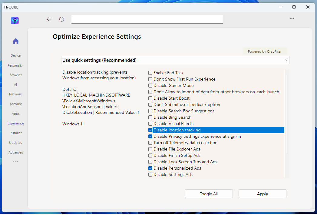6 – Outro recurso útil do Flyoobe é desactivar configurações que comprometem a sua privacidade. Clique em ‘Experience’ no menu lateral e escolha ‘Use quick settings (Recommended)’ no menu dropdown. Nesta área pode desactivar opções como o rastreamento de localização, anúncios personalizados em diversas áreas, a Pesquisa do Bing e a recolha de dados de telemetria, entre outras funcionalidades. Clique em cada uma das opções para ver em detalhe a que se refere e a chave de registo. Seleccione todas as definições que deseja desactivar e faça ‘Apply’.