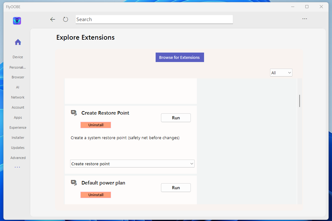 7- Se estiver preocupado em remover inadvertidamente aplicações e recursos importantes do Windows 11, crie um ponto de restauro do sistema como segurança. Clique com o botão direito do rato no ficheiro ‘Flyo.exe’ e seleccione ‘Executar como administrador’. Em seguida, vá a ‘Extensions’ na parte inferior da página inicial do programa; encontre a opção ‘Create Restore Point’ e clique em ‘Run’. O Flyoobe também tem uma extensão para restaurar as aplicações designada ‘Restore all built-in apps’, que reinstala todas as ferramentas que removeu com um único clique. Outra extensão remove totalmente o OneDrive para impedir que este seja executado e sincronizado em segundo plano.