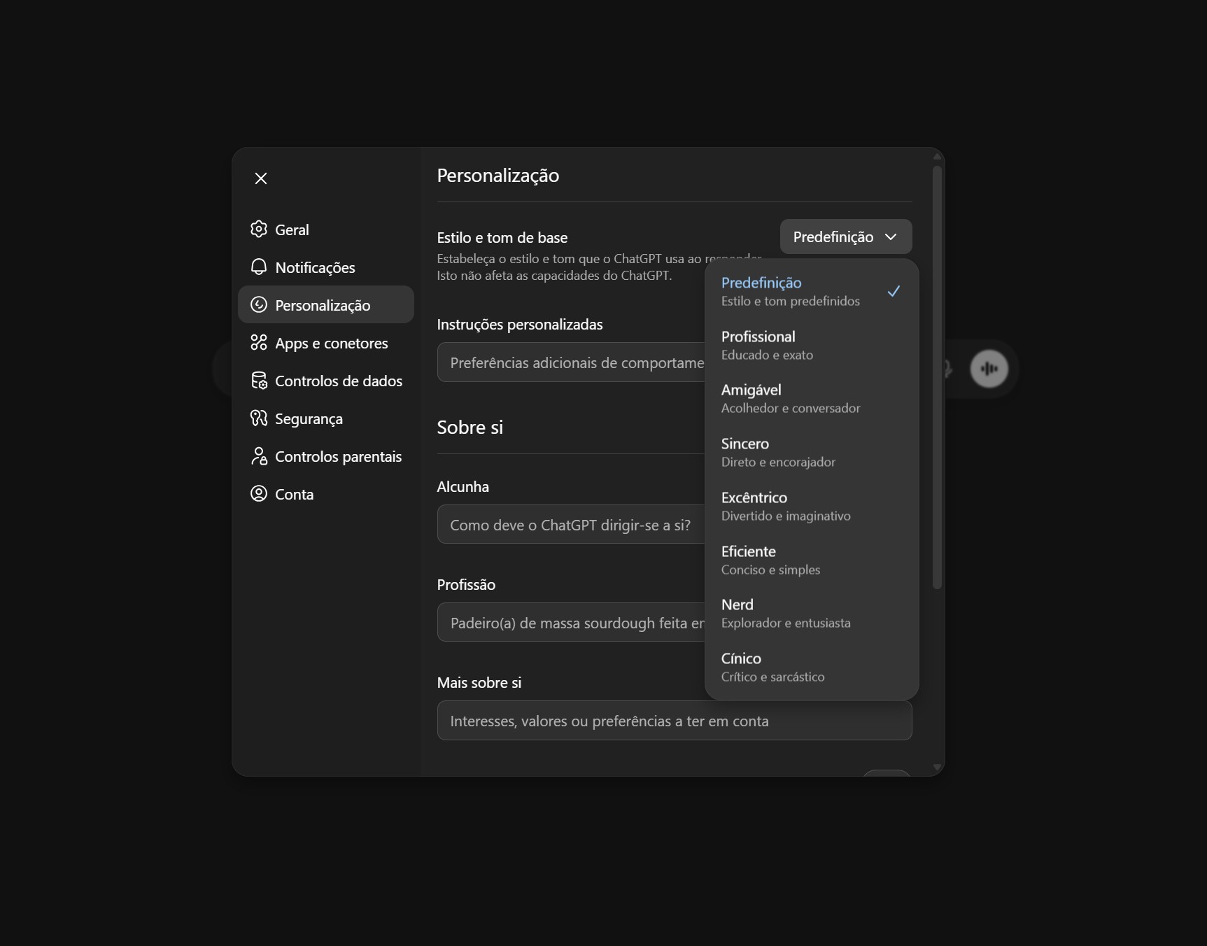 Para fazer isto, entre na app ou no site do ChatGPT, clique ou toque no nome da sua conta e escolha a opção ‘Personalização’. Clique no menu ‘Estilo e tom de base’ e seleccione o tom preferido.