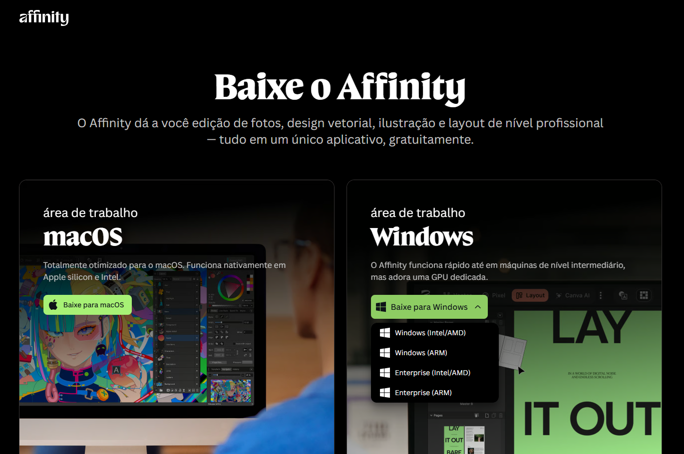 1 – Vá a affinity.studio/pt_br/download e clique em ‘Baixe para Windows’, seleccionando em seguida ‘Windows (Intel/AMD)’ ou ‘Windows (ARM)’ conforme o processador que tem no seu computador. Siga as instruções de instalação, abra o Affinity e clique no botão ‘Log in or sign up’. Isto irá abrir uma página com o início de sessão no browser; se já tiver uma conta gratuita no Canva, pode fazer o login. Caso contrário, siga os passos para criar um registo. Quando o Affinity abrir pela primeira vez, vai ver um vídeo a mostrar-lhe como funciona, o qual pode ver ou ignorar.