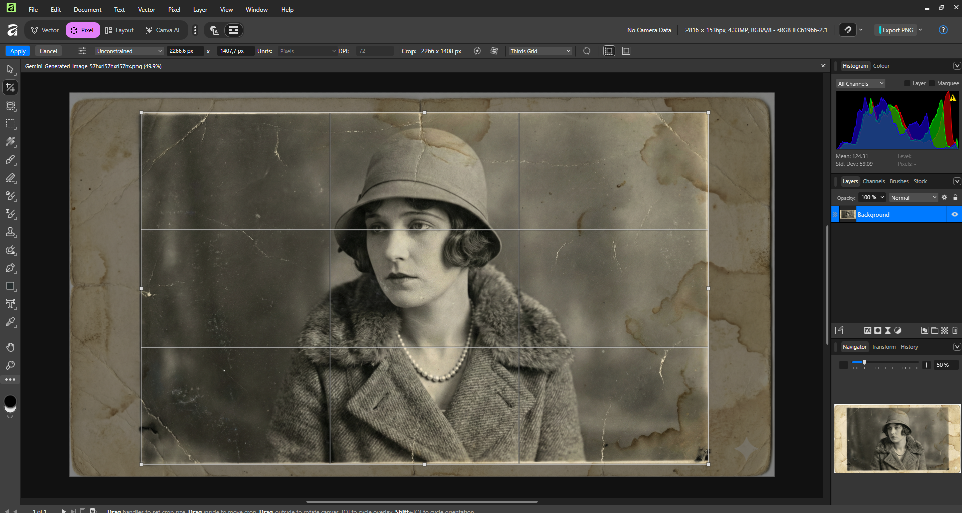 2 – Faça o scan da sua foto danificada e guarde-a no disco rígido. Abra a digitalização no Affinity – clique em ‘Open’ no canto superior direito, navegue até à pasta onde guardou o ficheiro, seleccione-o e faça ‘Abrir’. A imagem será aberta no separador ‘Photo’ com as diversas ferramentas existentes. No nosso caso, há muitos danos no rebordo da foto e a forma mais fácil de lidar com isso é cortá-los. Clique em ‘Crop’ e verá uma grelha aparecer sobre a sua imagem. Arraste a grelha para dentro, de modo que as áreas danificadas fiquem fora do quadro, e faça ‘Enter’ no teclado para terminar o processo.