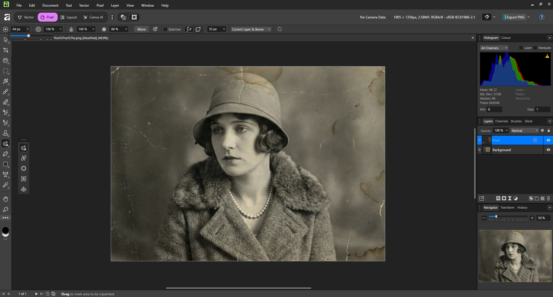 3 – Para reparar riscos e outros danos da imagem, clique no botão ‘Pixel Layer’ e, em seguida, em ‘Inpainting Brush Tool’. Em ‘Current Layer’ na barra de ferramentas superior, seleccione ‘Current Layer & Below’. O procedimento funciona melhor se clicar na opção Width e usar o slider para reduzir a largura da ferramenta ‘Inpainting Brush Tool’ para aproximadamente a largura dos riscos que deseja reparar. Pode também ser necessário ampliar a área que pretende reparar para uma melhor finalização: clique em ‘View’ > ‘Zoom’ > ‘In’.