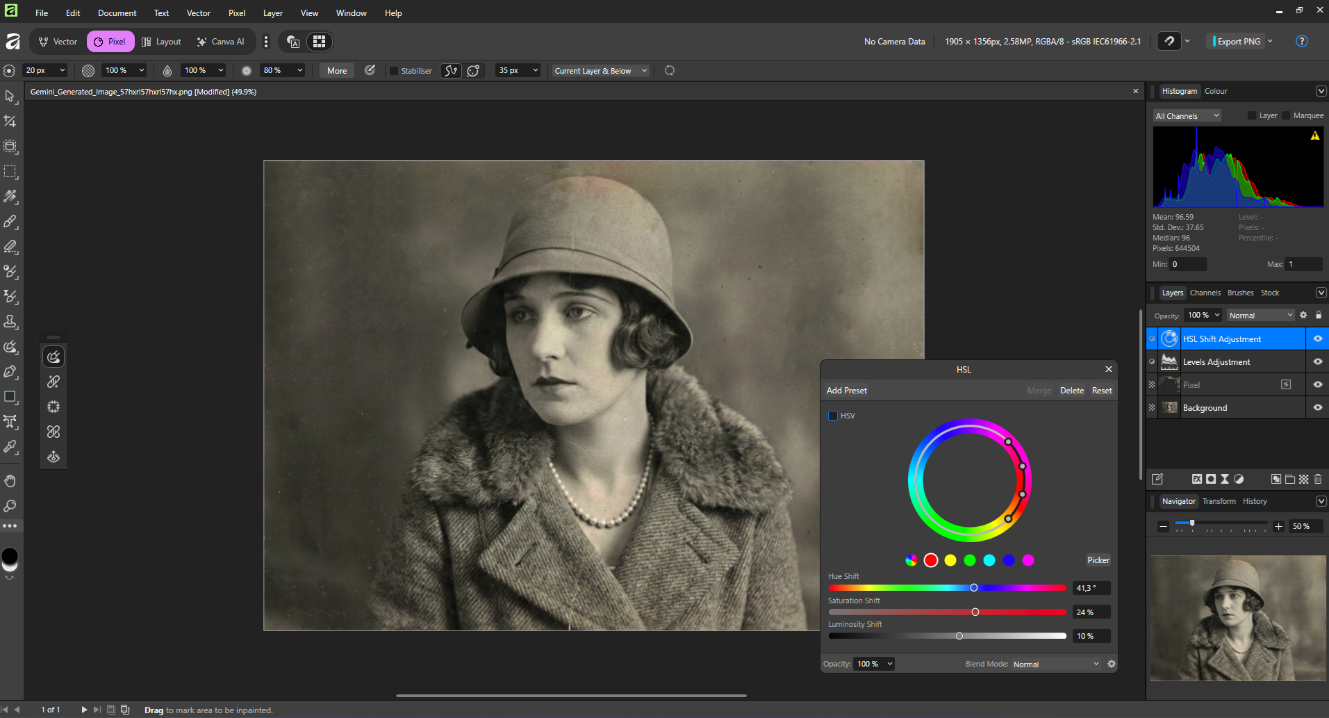 6 – Algumas fotos antigas podem apresentar uma tonalidade de cor pouco natural. Pode corrigir isso na opção ‘Adjustments’ e seleccionando ‘HSL’, que significa matiz, saturação e luminosidade. Se, por exemplo, a sua imagem tiver um tom avermelhado, clique no círculo vermelho para seleccionar a gama de cores vermelhas e, em seguida, use os sliders ‘Hue Shift’, ‘Saturation Shift’ e ‘Luminosity Shift’ para ajustar as cores, os tons e os níveis de brilho para que pareçam mais naturais. Clique em ‘X’ para fechar a janela quando terminar.