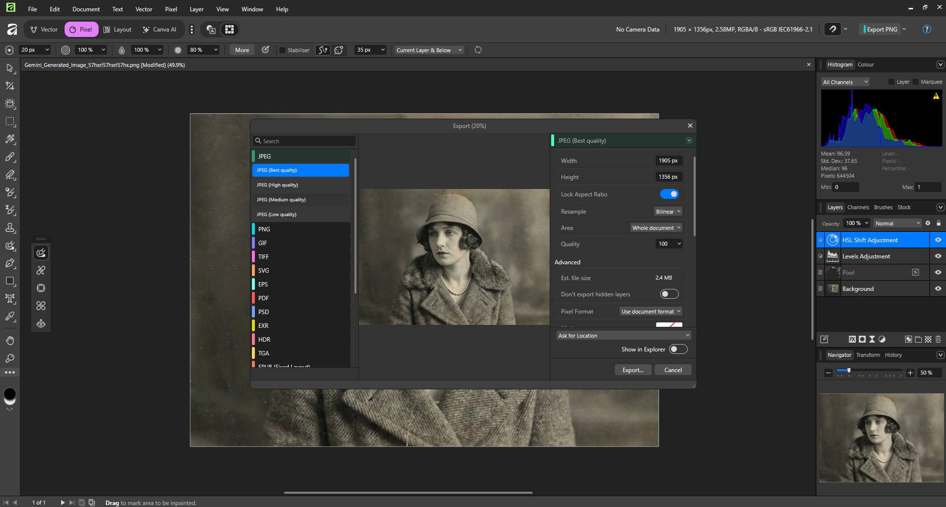 7 – É uma boa ideia guardar a foto reparada como um novo ficheiro Affinity (com todas as edições guardadas), para que possa abri-la e editá-la novamente mais tarde, se necessário. Clique em ‘File’ > ‘Save As’, escreva o nome que quer dar ao ficheiro, deixe o ‘Save as type’ definido como ‘Affinity Files’ e faça ‘Save’. Se quiser partilhar a foto com outras pessoas, terá de exportá-la como JPEG. Clique em ‘File’ > ‘Export’, escolha a opção ‘JPEG’ à esquerda e depois ‘JPEG (best quality)’. Deixe as outras configurações como estão, clique em ‘Export’, dê um nome ao ficheiro e carregue em ‘Save’.