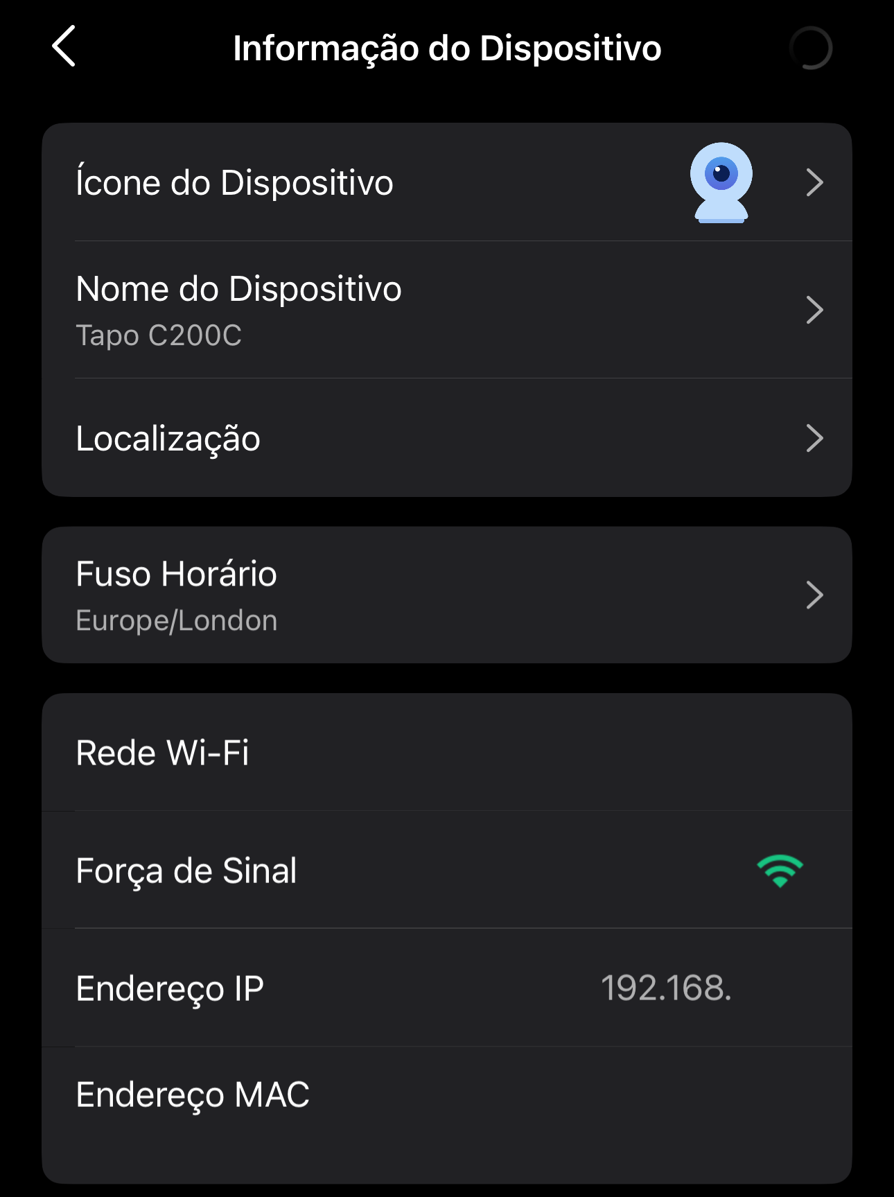Toque no nome da sua câmara na aplicação Tapo para confirmar que está a funcionar (se sim, o símbolo da câmara aparece a azul). Para permitir que outros dispositivos e aplicações acedam ao stream, configure um nome de utilizador e uma palavra-passe separados para a câmara. Para isso, abra as ‘Definições’ da câmara tocando no ícone do canto superior direito, seguido de ‘Definições avançadas’ > ‘Conta da Câmara’ e defina um nome de utilizador e palavra-passe. Pode descobrir o endereço IP da câmara ao entrar na interface de gestão do seu router e ver a lista de dispositivos ligados.