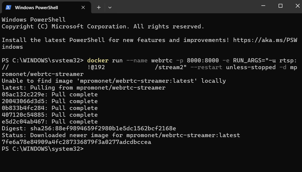 docker run –name webrtc -p 8000:8000 -e RUN_ARGS=”-u rtsp://username:password@IP_address:554/stream2″ –restart unless-stopped -d mpromonet/webrtc-streamer