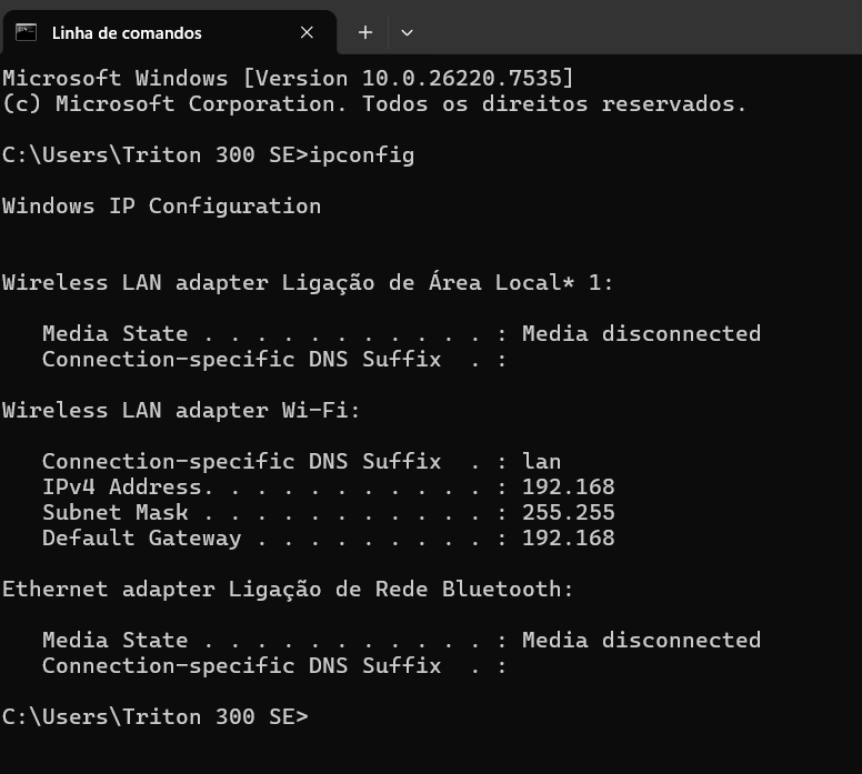 Pode ver o stream noutros computadores da sua rede local substituindo ‘localhost’ no URL que demos em cima pelo endereço IP do computador onde está a correr o Docker. Para o encontrar, abra a ‘Linha de Comandos’ e escreva ‘ipconfig’. Procure a entrada ao lado de ‘Endereço IPv4’. Use esse endereço em vez de ‘localhost’ para aceder ao stream a partir de outro dispositivo na mesma rede.