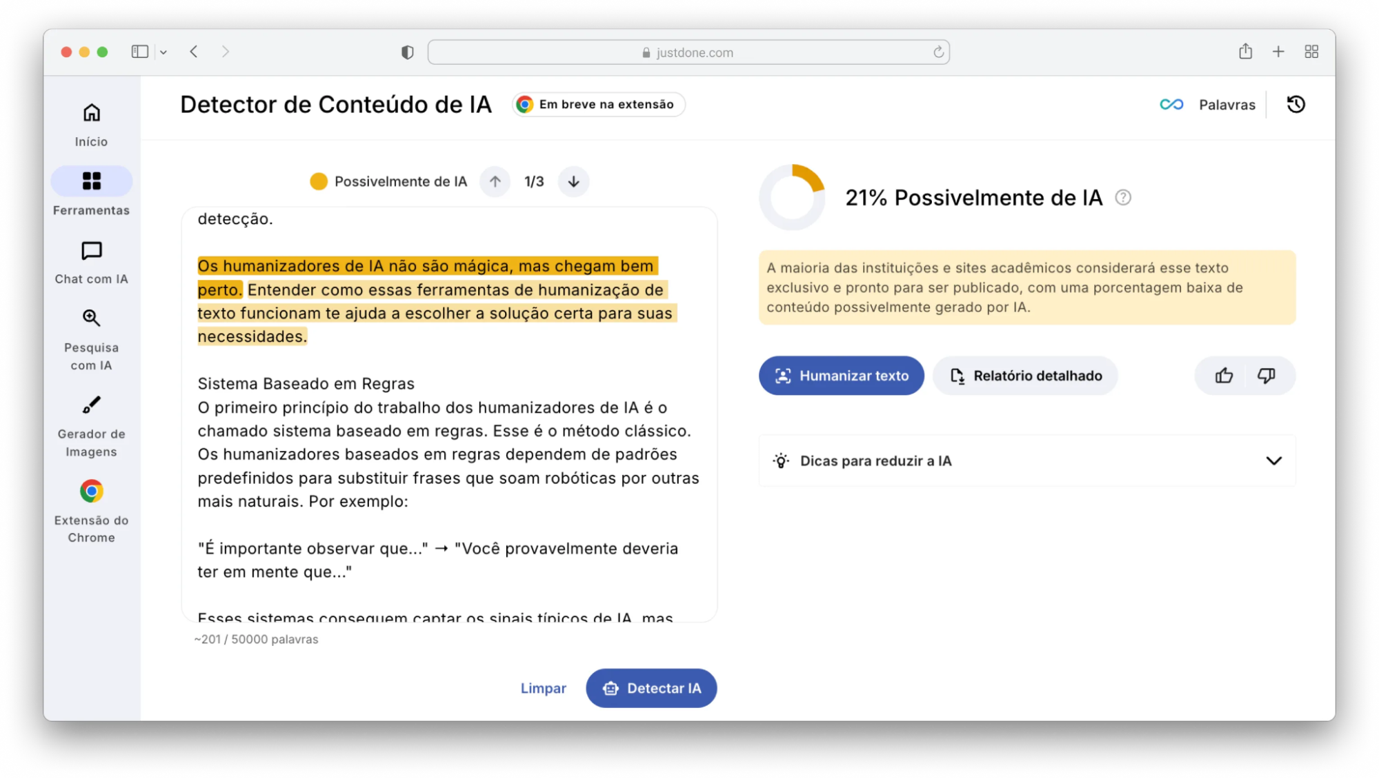 O que o JustDone AI mostra não é apenas uma percentagem global de “risco de deteção”. A plataforma marca os trechos específicos que apresentam padrões mais mecânicos. Isso é mais útil do que um número — porque diz-te exatamente onde tens trabalho a fazer.